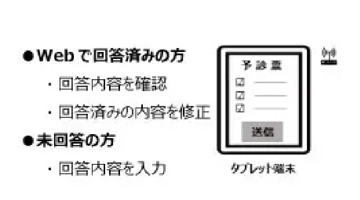 - 予診票をペーパーレス化(事前Web回答、当日タブレット入力)