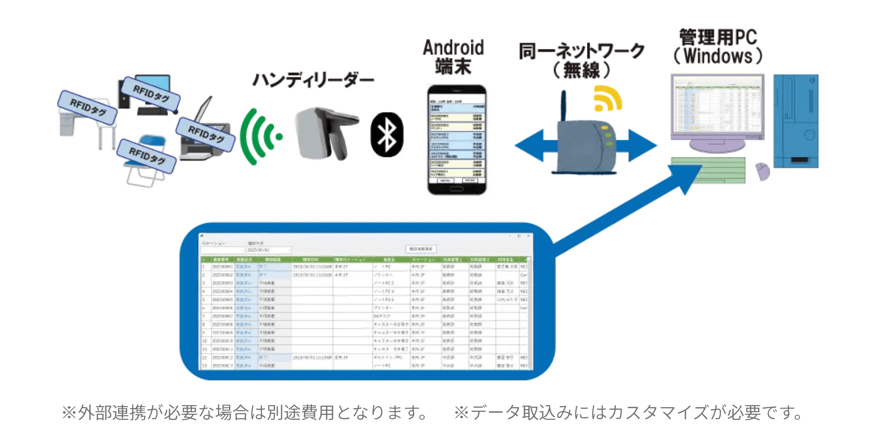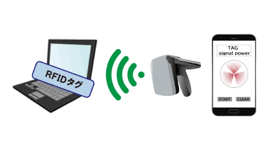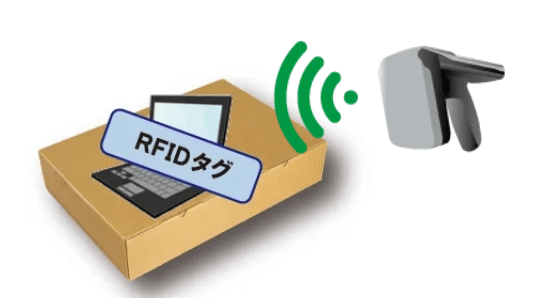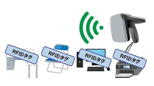担当者の熟知度にかかわらずハンディターミナル型RFIDリーダーを管理資産に向けてかざすことでRFIDタグを一括読み取ります。