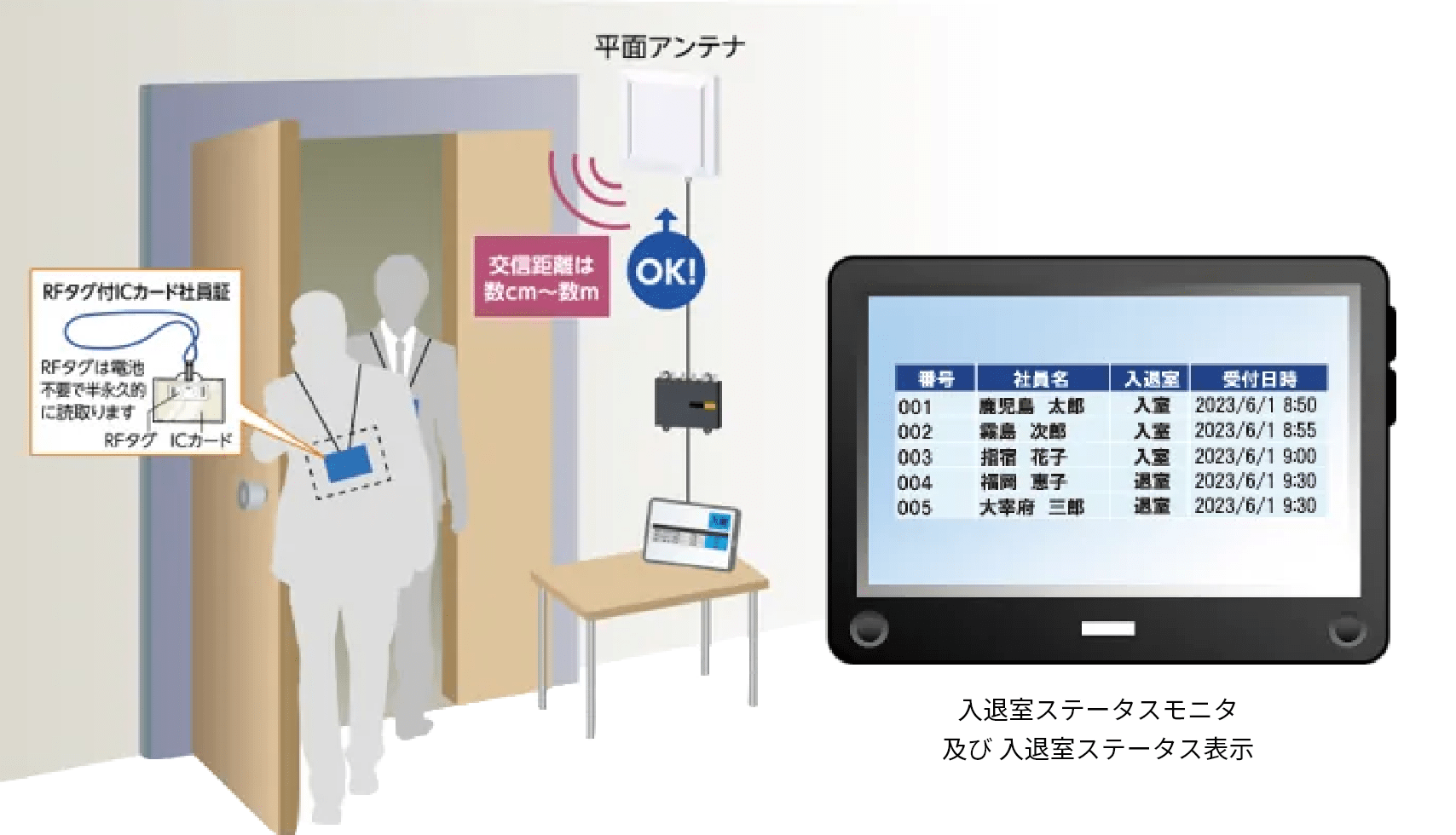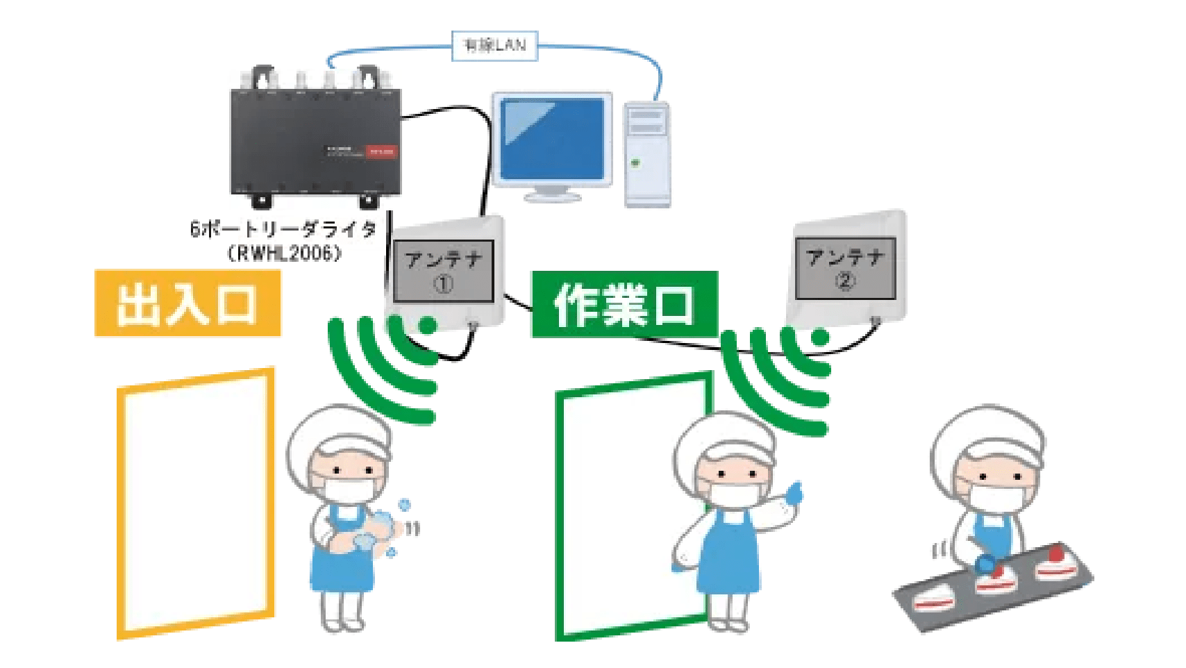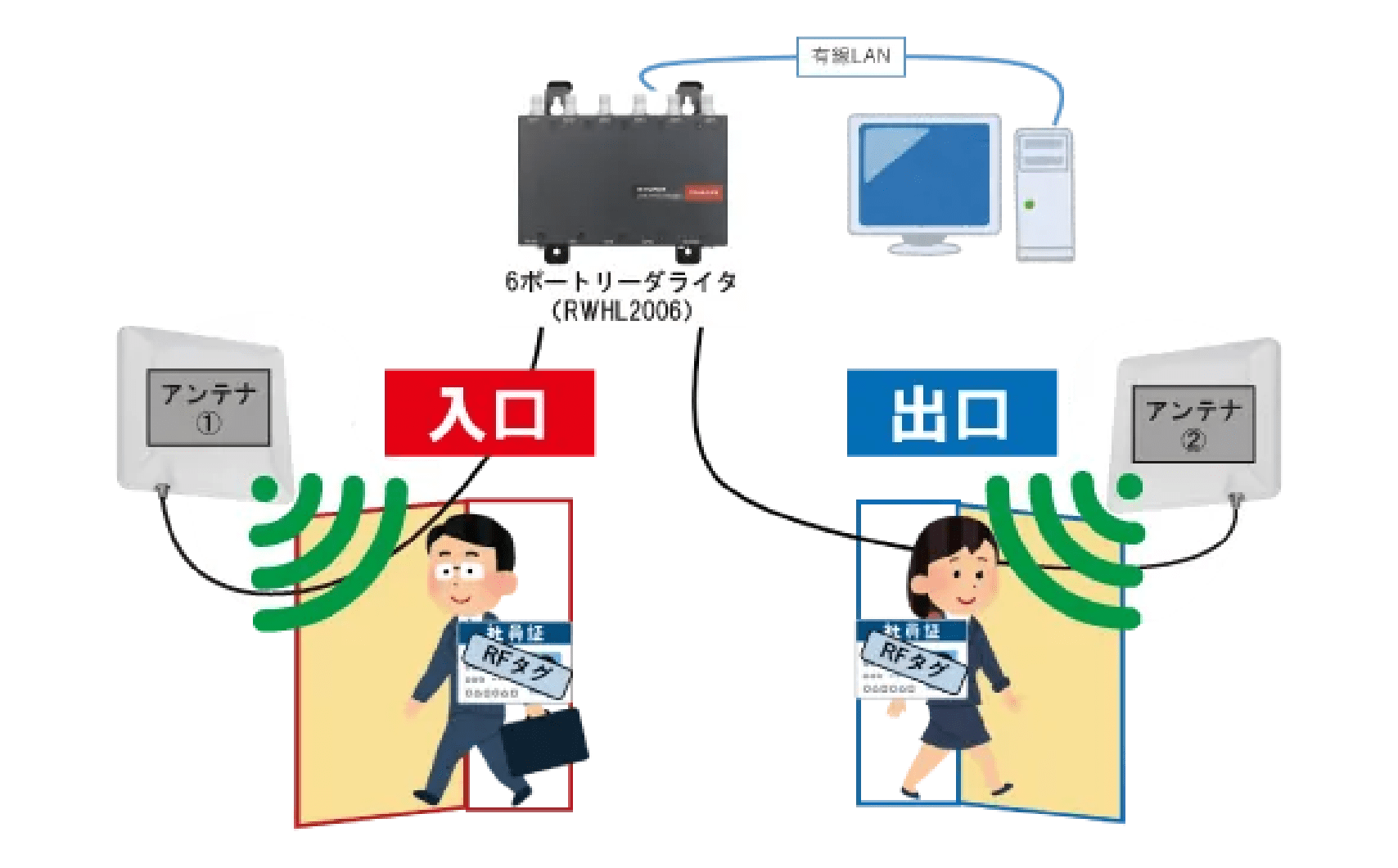 ※入退室を管理するために出入口が1ヶ所の場合でも入口用と出口用アンテナが2つ以上必要となります。